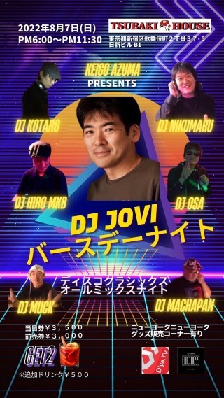 仙台ERIC ROSSのオーナーであり、80年代~には「THE REGENCY」「NEWYORK NEWYORK」「XENON」などの DJとして活躍したJOVIさんのBIRTHDAY BUSHを新宿TSUBAKI HOUSEで開催!!