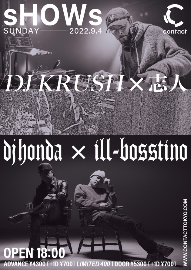 The recording of「GREED EGO」began spontaneously when ILL-BOSTINO visited the studio of dj honda for the first time, which led to their 16 track joint album「KINGS CROSS」. As ILL-BOSTINO states: "the sound is exceptional". Just like the title, it is a true masterpiece that intersects the two artists, a sound that digs deep beneath the surface and lyrics that face it head on. Stated once in an interview: “If I keep chasing hip hop like I am, I just might reach honda's field. That's something I'm really looking forward to." That's something I'm really looking forward to." The lyricist at the top of the hip hop scene goes head to head with dj honda for a combination live performance for the first time at Contact.