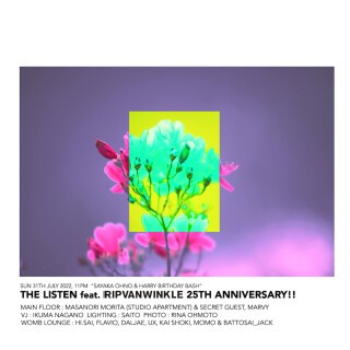 「変革」ではなく「進化を」求めるクラシック&コンテンポラリーなファッションブランド”RIPVANWINKLE”の25周年を記念し、テレビや様々なメディアへの出演、そしてファッションシーンのプレスとして長年活動し続けている Sayaka Ohno が音楽とファッションを融合した世界観を表現すべく、日本を代表するハウスミュージックプロデューサー/DJ の MASANORI MORITA (STUDIO APARTMENT)をはじめ、彼女が評価と期待を寄せる DJ 陣を迎え、音と映像によるコラボレートパーティーをオーガナイズ。