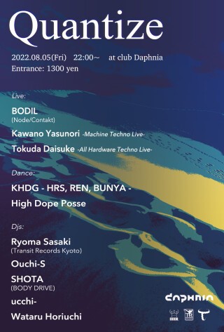 Kyoto House Dance Gene→HRS, Ren, Piro, Yusuke, Toru, Bunyaからなるニューヨーク・ロフトスタイルのハウスダンスチーム。京都を軸にクラブや野外フェスでダンスフロアを楽しむ。QuantizeではHRS, Ren, Bunyaの三人verで出演。ハウスダンス:1990年代ニューヨークで生まれた。様々なダンスを取り入れたステップと滑らかなフロアームーブを合わせたダンススタイル。ヨーロッパやアジアなど世界的な広がりをみせている。