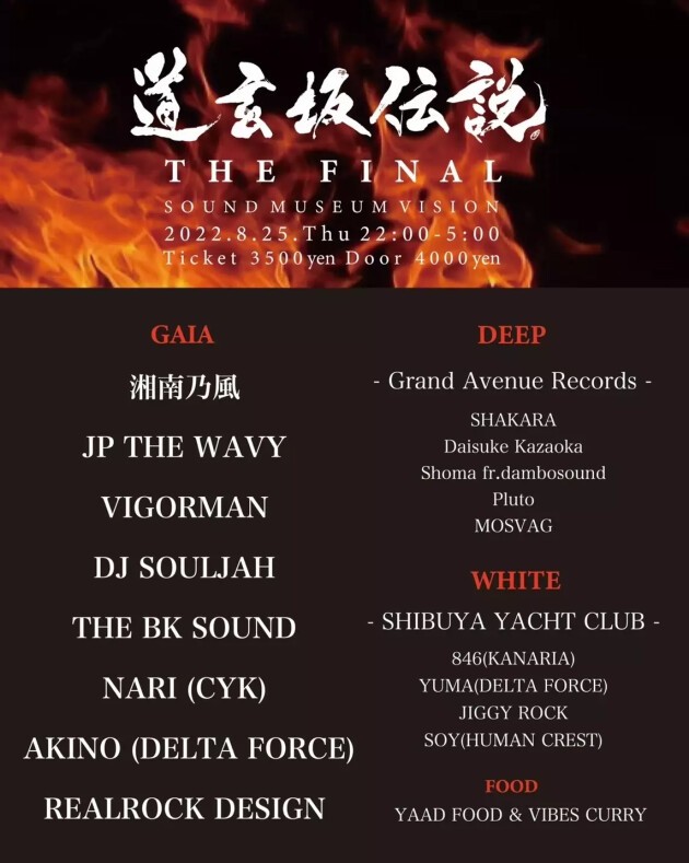 ■LINE UP -LIVE- 湘南乃風 JP THE WAVY VIGORMAN And more -DJ- DJ SOULJHA The Bk Sound NARI(CYK) AKINO (DELTA FORCE) And more VJ:REAL ROCK DESGIN DEEP ~ Grand Avenue Records ~ SHAKARA , Daisuke Kazaoka , Shoma fr.dambosound , Pluto , MOSVAG WHITE ~SHIBUYA YACHAT CLUB~ 846(KANARIA) , YUMA(DELTA FORCE) , JIGGY ROCK , SOY(HUMAN CREST) FOOD YAAD FOOD , VIBES CURRY