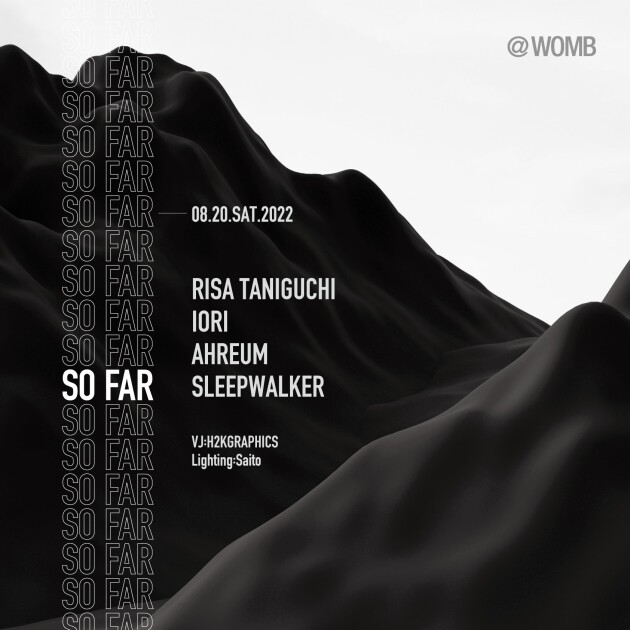 ニューパーティー SO FAR。硬派でダークなテクノサウンドを奏でる Risa Taniguchi を筆頭に、2012年に活動の拠点をベルリンに移し BERGHAIN、TRESOR を中心にヨーロッパの各都市でプレイし、2015年から拠点を東京に移しテクノを中心にしながらも様々なジャンルのパーティーに参加している IORI、自身の世界観を MELODIC TECHNO/HOUSE に投影し、変化自在に MIX してゆくスタイルがクラウドを魅了する AHREUM、ディープからミニマル/ダブ/アシッドを取り入れ、エモーショナルなトリップを作り上げる Sleepwalker がラインナップ。音楽にどっぷり浸かる一晩をお楽しみください。