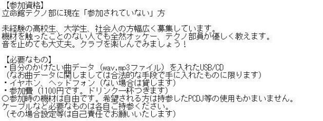 参加資格・・・「現在立テクに所属していない方」なので、社会人だけでなく立テクが気になっている高校生の方も大歓迎です(高校生以下の方は22時までにご退場願います)