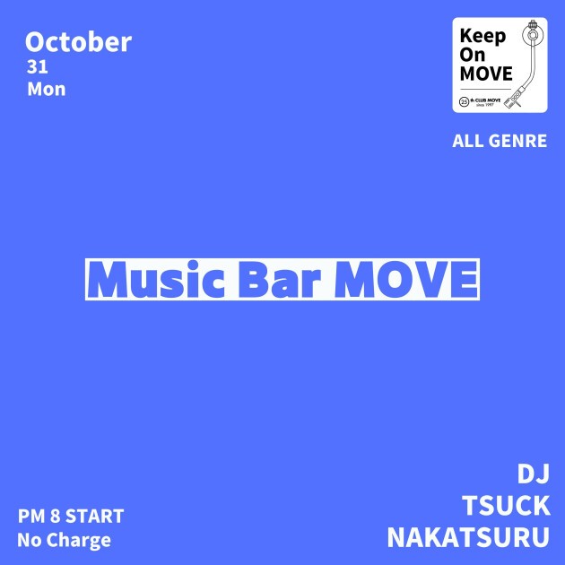 この日はMOVE界隈の様々なDJ達が音楽を担当します。 10/31(月) Music Bar MOVE (ALL GENRE) PM 8 START 入場無料 MUSIC by TSUCK / NAKATSURU
