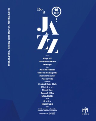 2006 年 に京都COLLAGEにて始動、そして2014年ここMETROへと場所を変え、クラブ以外でも屋上のルーフトップやカフェ・バー、ラウンジ、ショップレセプション、 国際写真展とのコラボレーション等活動を広げ、日本、世界の著名DJを招待し、京都のJAZZ/CROSSOVERミュージックを発信し続けてきた、"DoitJAZZ!"は2022年11月3日、文化の日の祝日に16周年パーティを開催します。昼下がりの夕方からは京都ローカルDJsとジャズダンサーズが「ジャズで踊る」文化をエモーショナルな生音ジャズとともに表現し、後半はパリを拠点に活動するDJ/プロデューサー「Hugo LX」、関西ジャズシーンを支え続けてきたレジェンド、Kyoto Jazz Massive「沖野好洋」、フルアルバムもリリースし精力的な活動をしている「M-Scape」をゲストにCrossoverサウンドが繰り広げられます。16年の間、関わってくれたすべての人達に感謝の気持ちを込めて、ジャズが持つ過去現在未来、多種多様な人達が奏でて来た音楽を一夜にして体感できる豪華ラインナップでお送りいたします。是非楽しんでください。