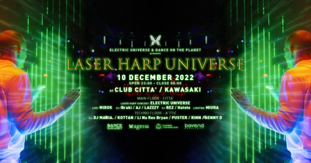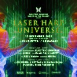 レーザーハープはまさにハープ(竪琴)のようにレーザーを弾くことで音を鳴らし、その弦に触れる高低によって変幻自在に音色を変える先進的な楽器。ELECTRIC UNIVERSEはこのレーザーハープを完璧なまでに自らのセットに取り込み、そのパフォーマンスは世界的に見ても類を見ないほどに高い完成度と音楽性の融合を誇っています。