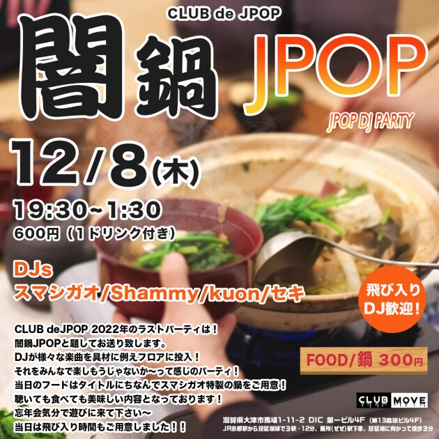 CLUB deJPOP 2022年のラストパーティは!闇鍋JPOPと題してお送り致します。DJが様々な楽曲を具材に例えフロアに投入!それをみんなで楽しもうじゃないか~って感じのパーティ!
