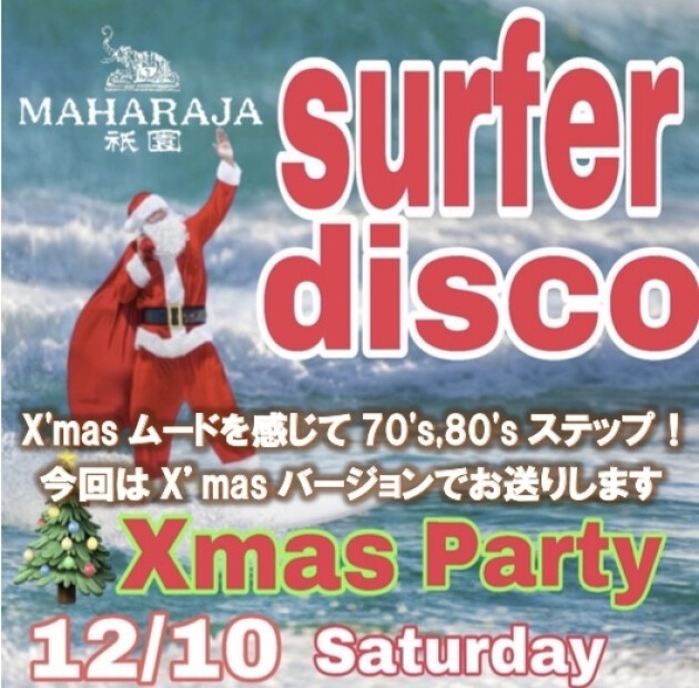 X'masムードを感じて70's 80'sステップ! 今回はX'masバージョンでお送りします.マハラジャ生誕40周年を記念して12月の毎週土曜日22時~23時にご来店の女性の方は入場料半額キャンペーンをご利用できます。女性1500円(2D)