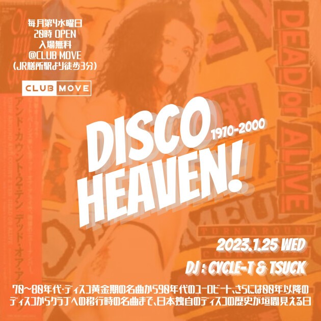 70~80年代・ディスコ黄金期の名曲から90年代のユーロビート、さらには00年以降のディスコからクラブへの移行時の名曲まで、日本独自のディスコの歴史が垣間見える日。