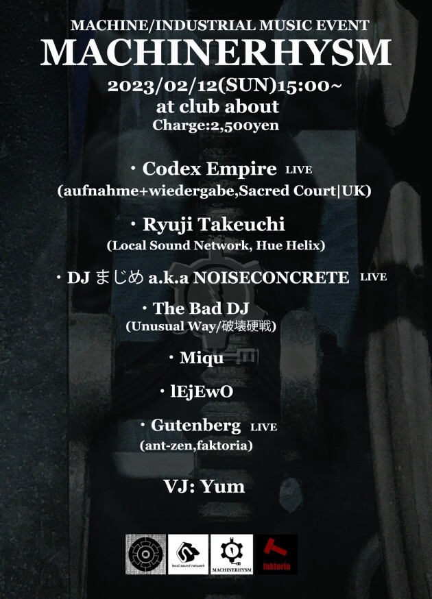 MACHINE + RHYTHM + ISM = MACHINERHYSM(マシナリズム) 名古屋のIndustrial Musicを軸としたEvent/Labelである “faktoria”の暖簾分けしたサブイベントとして 誕生したMachine/Industrial