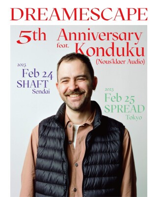 DREAMESCAPE, which has been YUI's open-close DJing with the theme of ALL ELECTRONIC MUSIC, has featured asyl cahier and Ko Umehara from Tokyo, Asusu (Livity Sound), Bruce ( Hessle Audio / Timedance ), Resom (://about blank), Vladimir Ivkovic and others from abroad.
