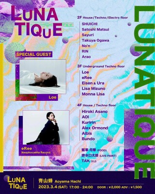The House/Techno Party "LUNATIQUE", which is held irregularly at Aoyama Bachi, will be held again on the night of Saturday, March 4th, with three floors open to the public, and will be held again with a longer time and volume than the last party in November.
