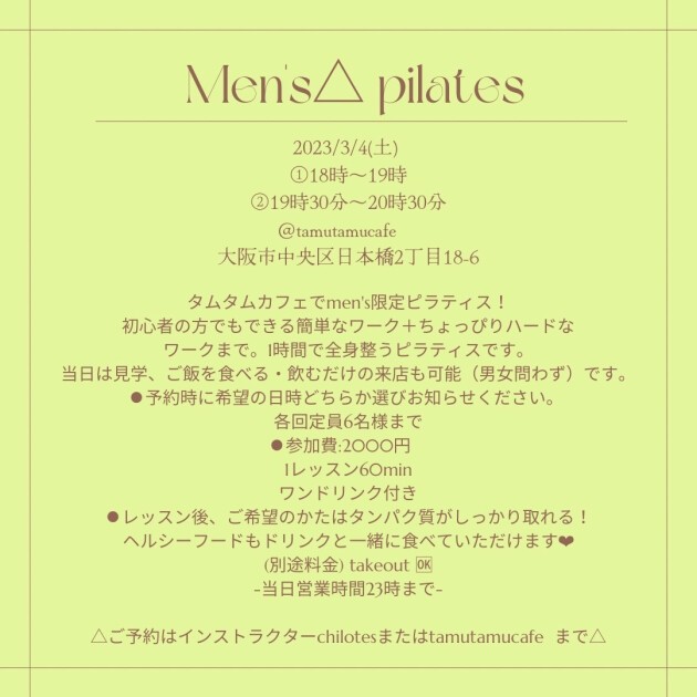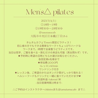 タムタムカフェでmen's限定ピラティス!初心者の方でもできる簡単なワーク+ちょっぴりハードなワークまで。1時間で全身整うピラティスです。当日はどなたでも見学、飲みやご飯を食べるだけの来店可能です。レッスン後、希望の方はタンパク質がしっかり取れる!ヘルシーフードもドリンクと一緒に食べて頂きます。当日営業時間23時まで。ご予約は☞ インストラクター @chilopilates または @tamutamucafe まで△