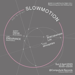 Ambient party "SLOWMOTION" by AOKI takamasa,ENDURANCE,Loe. The second event will be held with Dérive as the guest.