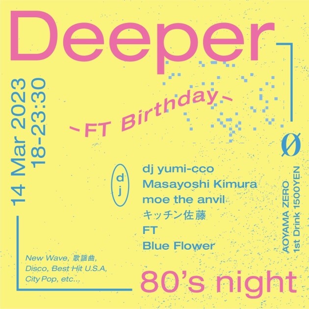 3月のDeeperは、FTのバースデーを兼ねた80's Nightです。New Wave、テクノポップ、Best Hit U.S.A、歌謡曲、CityPop、Discoなど、幅広いジャンルの80'sを楽しめます。出演するdjたちは、80年代の音楽に詳しく、それぞれのプレイスタイルで幅広いジャンルをカバーします。