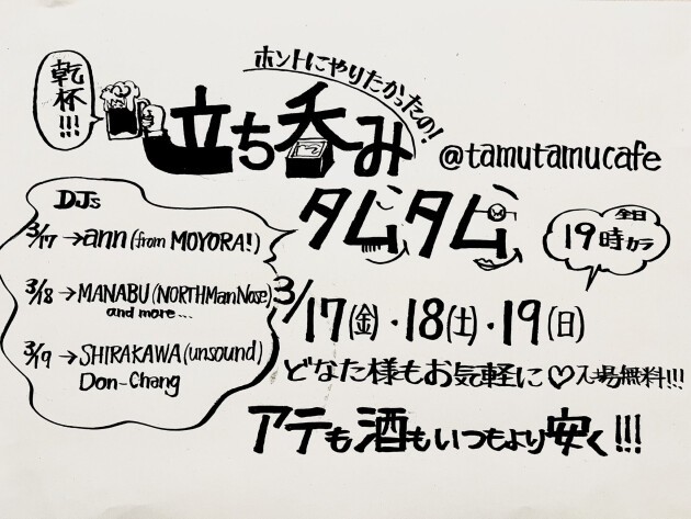 やりたくてウズウズしていた不定期開催の企画が今年も帰ってくる!!3月17日金曜〜19日日曜は『立ち呑みタムタム』久しぶりに開催〜☆サッポロ赤星の大瓶や、サッポロ樽チューハイ、アテだってお手頃な立ち呑み価格◎華を添える素敵なDJ陣にもグッドミュージックをお願いしています♫普段とは違うタムタムカフェをお楽しみ下さい!