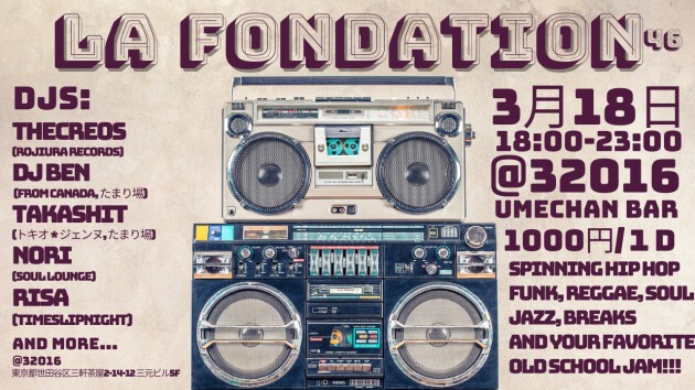 LA FONDATION Crew is proud to present our party's 46th edition. Our Djs will rock the place for an unforgettable event full of those old school joints !! Let's set Sangenjaya on fire !!!