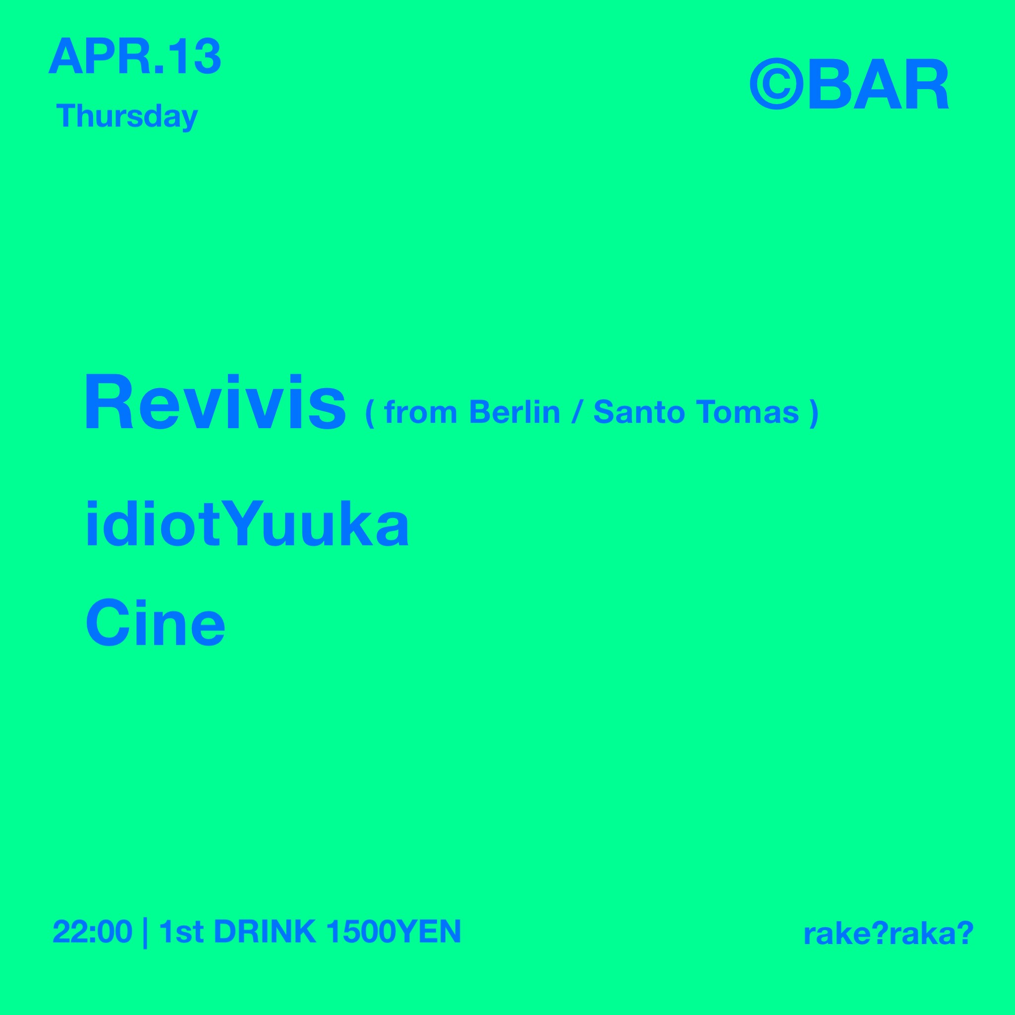 Tonight's ©︎BAR is REVIVIS in London, which has released high-quality works from minimalist key points such as 〈WE_R HOUSE〉〈TALMAN〉. In addition to the above, a talented group that has released from under the umbrella of . And in Osaka, idiotYuuka, a female DJ who has performed with many famous DJs both domestically and internationally, will dance with a nice groove that can freely manipulate house-techno. Let's enjoy from weekdays.