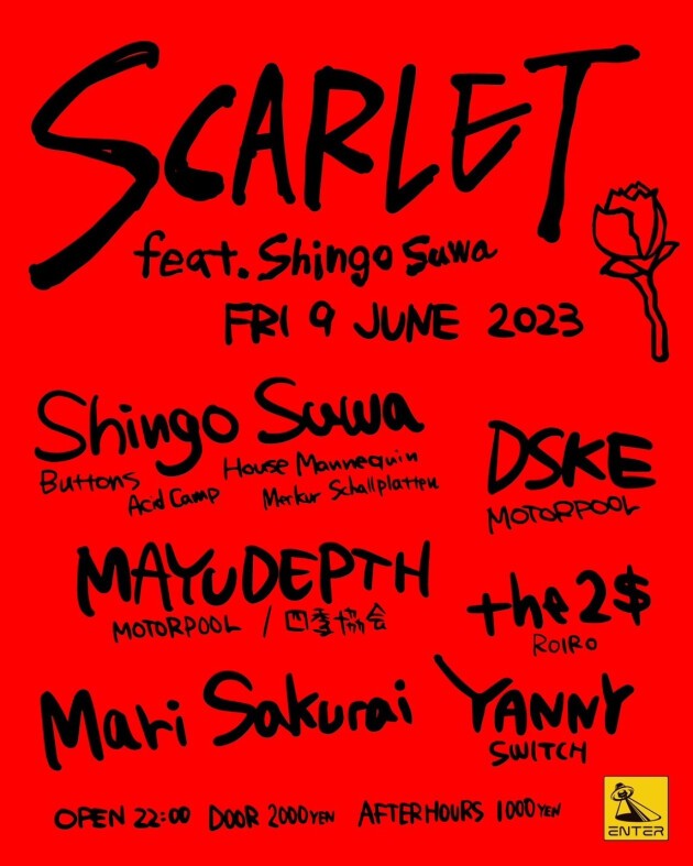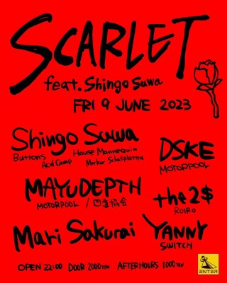 ベルリンのアンダーグラウンドシーンが誇るDJ、プロデューサーのShingo Suwaが日本へ帰還!ツアーを敢行し久々に東京でプレイする。 Shingo Suwaは2005年に日本からベルリンに拠点を移し、プロデューサーとしてAkira Hawksとのプロジェクト〈House Mannequin〉やLAの〈ACID CAMP〉などからアンダーグラウンド・テクノ/ハウスの傑作の数々をリリースしてきた。その傍らヨーロッパで最もアナーキーなパーティとして知られていた Homopatik 、ベルリンで絶大な人気を誇るマンスリー・クィア・パーティ Buttons のコア・メンバーとしても活動している。テクノをベースに、デトロイト、アシッド、ディスコ、ダブ、エクスペリメンタル、インダストリアルなど異なる要素を交えた12時間以上に及ぶロングセットでもベルリンのローカルシーンに於いて高い評価を得ているShingo Suwa。刺激とグルーヴに満ちたトリップ感覚に是非身を委ねてほしい。 今回 Scarletと題しパーティのホストを務めるのは MOTORPOOL をキュレーションしてきたMAYUDEPTHとDSKEだ。DSKEはHomopatikでShingo Suwaと共演しており、MAYUDEPTHは昨年ドイツのレーベル〈Ohrfeigen〉から「dawn seaward (Shingo Suwa Remix)」をリリースしている。共演にはレーベル〈ROIRO〉をスタートしプロデューサーとしても頭角を表すthe2$、アフターアワーズは東京の人気クィア・パーティを手がける二人、 SLICK を主宰するMari Sakuraiと SWITCH レジデントのYANNYが出演。豊かさと手腕を持ち合わせたDJ陣により終演までその解放的なグルーヴは途切れる事なく続いていくだろう。