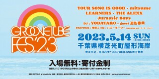千葉県横芝光町屋形海岸で行う海辺のフリーフェスGROOVETUBE FES’23 を5/14 (日)に開催します。3年ぶりとなる今回はYOUR SONG IS GOOD、ミツメ、LEARNERS、Jurassic Boys、THE ALEXX、DJ YODATARO、遊佐春菜、を迎えます。