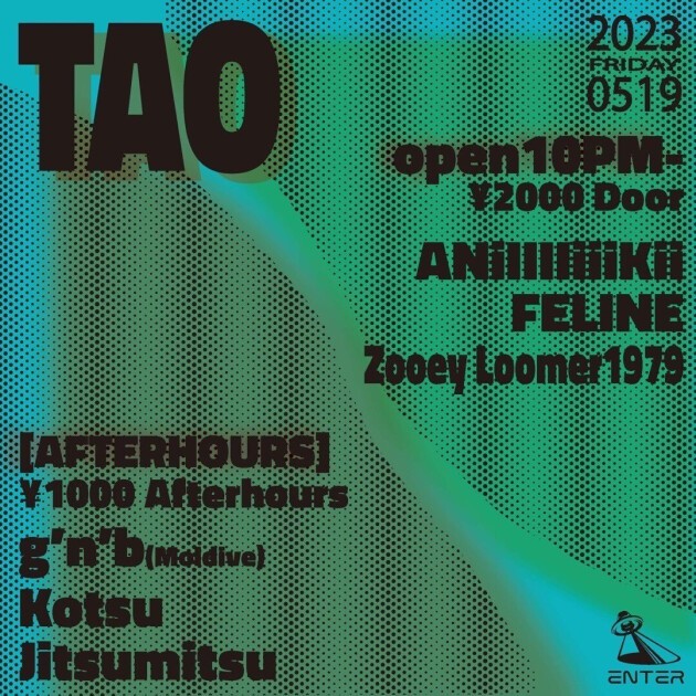ENTERで再始動したTAO。今回は流浪を重ねながら野外パーティーからローカルのクラブまで幅広く活動を続けるANiIIIIiiiKii、重厚感と躍動感を兼ね備えて、鮮やかにフロアをリードしていくFELINEとNTSなど国内外のポッドキャストにミックスを提供するZooey Loomer 1979が登場。アフターにはg’n’b、Kotsu、Jitsumitsuと豪華ラインナップが揃う。