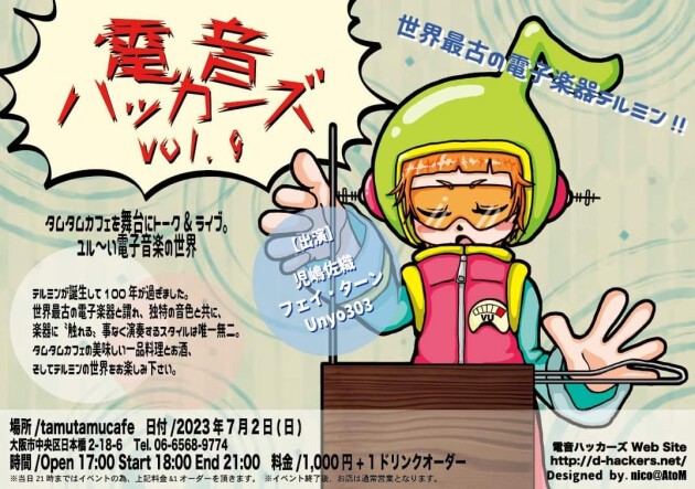 世界最古の電子楽器テルミン!!《タムタムカフェを舞台にトーク&ライブ。ユル〜い電子音楽の世界》テルミンが誕生して100年が経ちました。世界最古の電子楽器と謂れ、独特の音色と共に、楽器に〝触れる〟事なく演奏するスタイルは唯一無二。タムタムカフェの美味しい一品料理とお酒、そしてテルミンの世界をお楽しみ下さい。