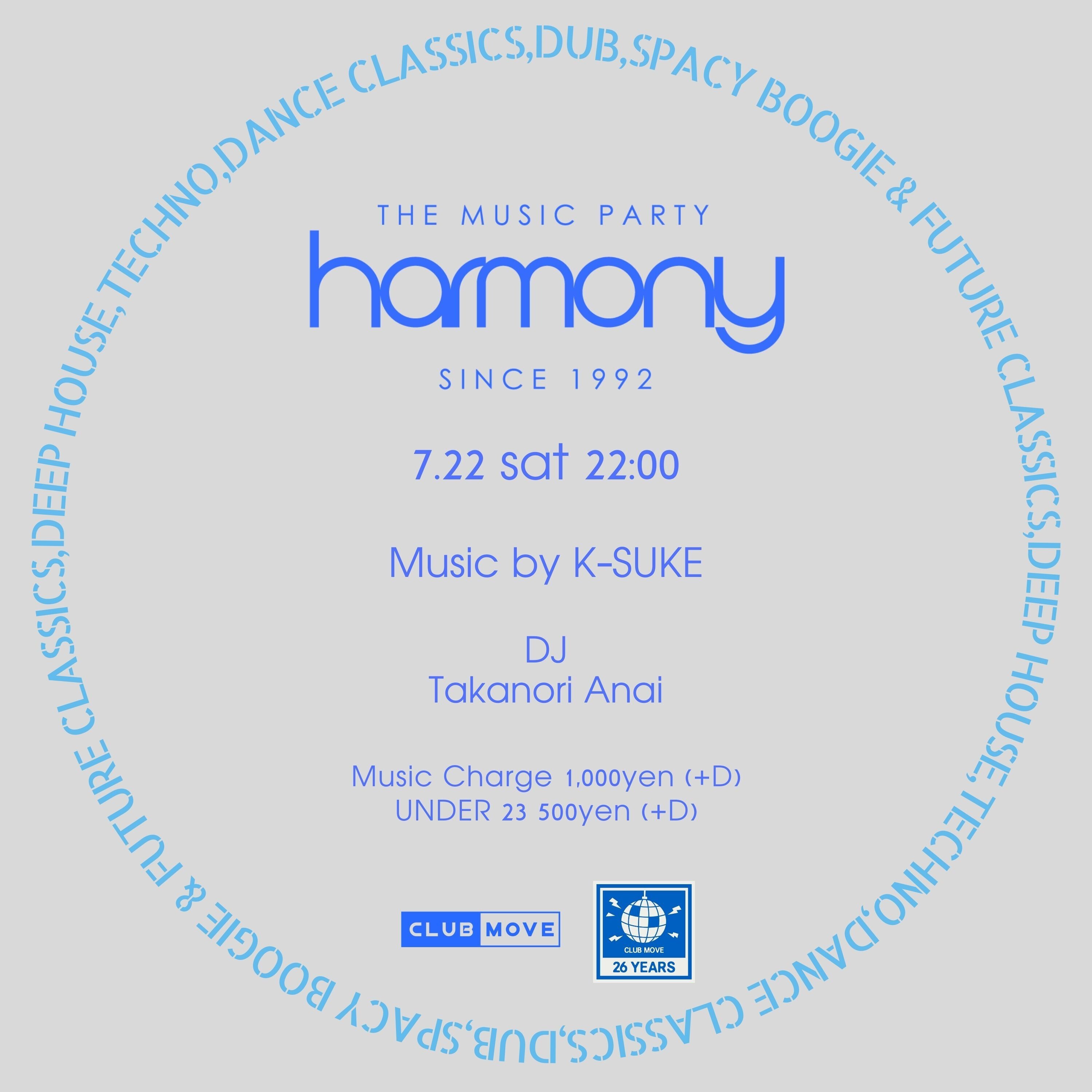 7月は第4土曜日に開催のHARMONY、 "Takanori Anai" とHOUSEやDISCOにJAZZなど様々なジャンルや時代のミュージックジャーニーをお届けいたします。音楽を取り巻く環境の変化が著しい昨今、このHARMONYだけはいつも変わらず温かい場所であり続けたいと思います。新旧織り交ぜて、様々なジャンルをクロスオーバーさせて、刺激的なミュージックライフを今回もみなさんと楽しんでいけたら幸いです。