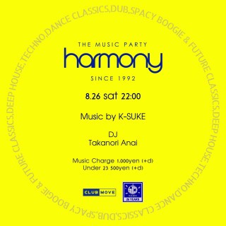 8月のHARMONYは "Takanori Anai" とHOUSEやDISCOにJAZZなど様々なジャンルや時代のミュージックジャーニーをお届けいたします。