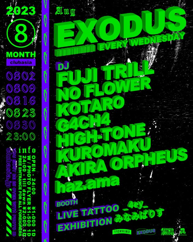 FUJI TRILLをはじめ多方面に活躍するDJ,BeatMakerが毎週水曜渋谷の夜をにぎわす通称" #エクソ "。LIVE TATTOO、PAINT、NAIL ART、EXHIBITIONも隔週でcheck。外国からのお客様は入場フリー!!是非お越しください!!