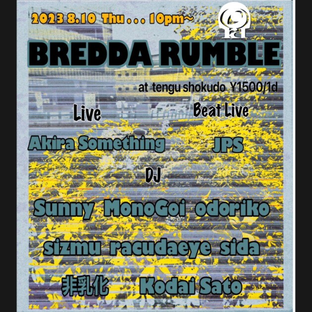 「BREDDA RUMBLE」2023 8/10 (Thu) Oopen 22:00〜 at TENGUSHOKUD三軒茶屋 1:30_ racudaeye 新宿四打 Entrancn ¥1500/1D