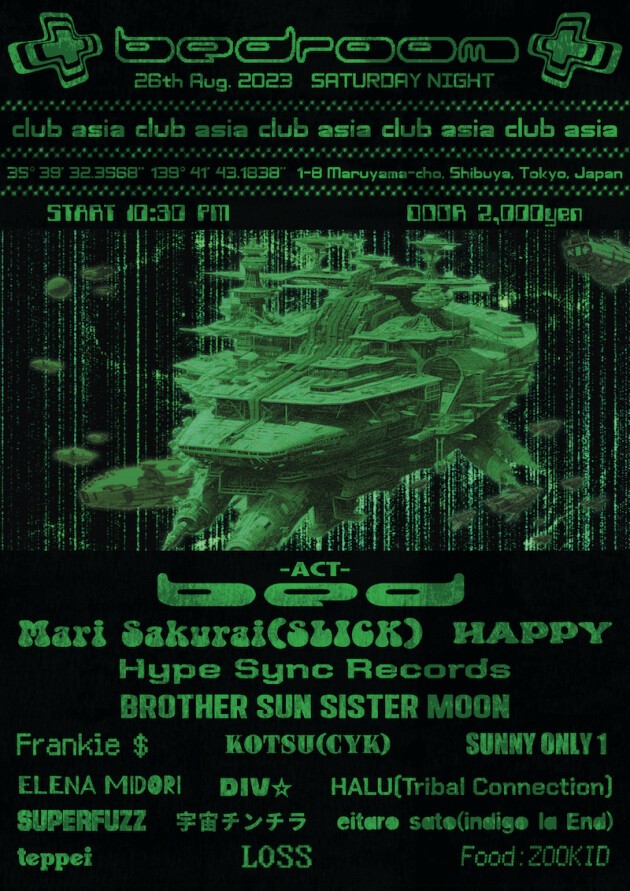 The pandemic has brought urban club life to a crossroads. Perhaps the visceral, trippy tempests of today's dance music, winds of change brought by years of uncertainty in the nightlife world and subsequent shifts to outdoor raves, were what blew it here. And as many of us had the time, if not the choice, to take a good, long look at ourselves, we have come to seek greater purity in and deeper meaning from our leisure. The benchmark for pop- ups and private parties has been pushed higher. Genres and labels vaporized in the heady cultural crucible of the late 2010s, and we now find ourselves in a post-genre world. We cannot turn away from this newest face of the zeitgeist. bed was born just as this flux roiled forth. We tie together techno, house, trance, psychedelic, and ambient sound, and have cut a path through clubs and concert halls alike to assert ourselves as a rock band and as artists. We and our friends at club asia, a vanguard of the new club scene, now come together to bring you bedroom, a space for a new generation. Not one marked by days or years, but one for all spirits that reject stagnation and stillness. Come to bedroom, and bask in the overpowering furor of the now.