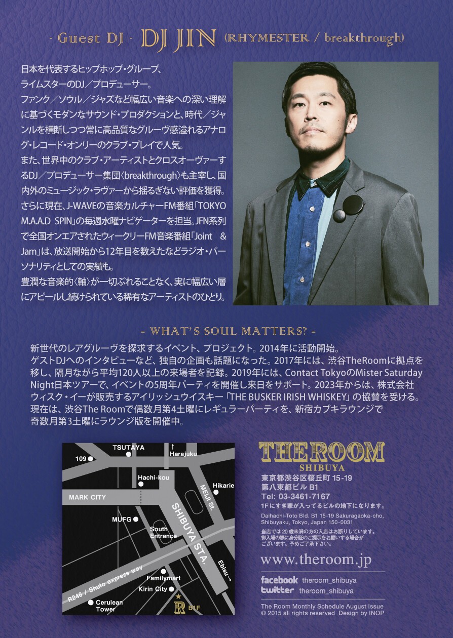 “新たなレアグルーヴを探求するパーティ”をコンセプトに、偶数月の第4土曜日に渋谷にあるミュージックバー「THE ROOM」にて開催される「Soul Matters」とコラボレーション。アットホームな雰囲気の中、ソウルやジャズ、ラテン、ハウスなどのライトなファンからコアなファンまで