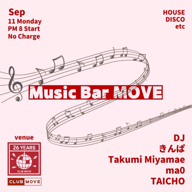 DJ BAR営業のこの日はMOVE界隈の様々なメンバーがプレイします。 9/11(月) Music Bar MOVE (HOUSE,DISCO etc) PM 8 OPEN 入場無料 MUSIC by きんぱ (El Musica) / Takumi Miyamae / ma0 (LinK) / TAICHO (CLASSIC STATE)