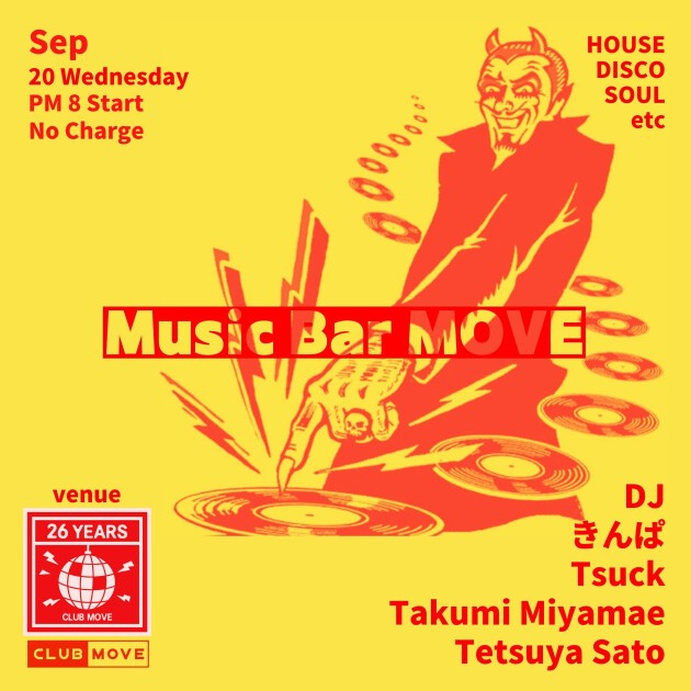 DJ BAR営業のこの日はMOVE界隈の様々なメンバーがプレイします。 9/20(水) Music Bar MOVE (HOUSE,DISCO,SOUL etc) PM 8 OPEN 入場無料 MUSIC by きんぱ (El Musica) / Tsuck (Disco Heaven!) / Takumi Miyamae / Tetsuya Sato (Round)
