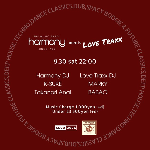 9月はMOVEにて毎月第2火に開催中の "LOVE TRAXX" より "MARKY" と "BABAO" をゲストに迎えます。