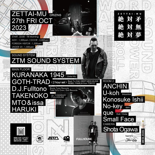 90年代レイヴ・カルチャーから現代まで続く 日本随一のロングランパーティー『ZETTAI-MU』Glocal な音の交差点 大阪 NOON レギュラーダンス10月!! UKの名門ダブステップ・レーベル〈DEEP MEDi MUSIK・DMZ〉と契約する唯一無二の日本人アーティスト GOTH-TRAD !! 「Juke」「Footwork」シーンを代表する Booty Tune より DJ.Fulltono !! 大阪ミナミのチャンピオン FULLHOUSE から TAKENOKO ex.YOUNGEASY !! メインフロアーには ZTM SOUNDSYSTEM!! 2ndエリアやWarm Upタイムには関西 Original Gen.Z ダンスミュージックシーンを代表する若手が集結!! Osaka’s leading clubnight pushing all things Bassweight!!All Tribes Welcome!!会場はクラブ風営法改正の象徴 大阪を代表する老舗 NOON+Cafe!!