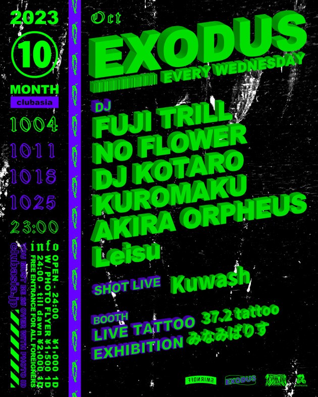 FUJI TRILLをはじめ多方面に活躍するDJ,BeatMakerが毎週水曜渋谷の夜をにぎわす通称"エクソ"。LIVE TATTOO、PAINT 、EXHIBITIONも隔週でcheck。外国からのお客様は入場フリー!!是非お越しください!!