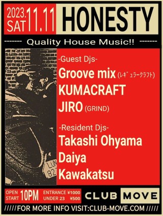 GUEST DJとして大阪府枚方市にて Vinyl & Dj's Audio ショップ「レギュラークラフト」を経営し、様々なジャンルのDJ達も全幅の信頼を寄せている "Groove mix" を招聘。さらに神戸/大阪にて開催されているハウスパーティ "Oasis" から "KUMACRAFT"、また大阪/東京にて開催されているハウスパーティ "GRIND" から "JIRO" が参加。乞うご期待なバイナル・オンリー・ナイトです。お見逃しなく!!