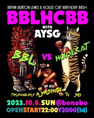 Mr.FUJIROCK BRYAN BURTON-LEWISとMr.AFTER-HOURS HouseCatのBIRTHDAY BASH!!個性溢れるプレイで活躍しているAYASHIGE,7e,TEA YOUNG DAY,SEIが共にpartyを盛り上げる♫