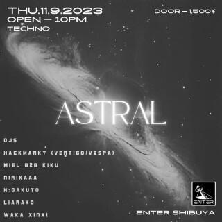 LiaRakoとWAKA XINXIオーガナイズのASTRALを開催。ミニマルテクノ、ディープテクノを中心にプレイし、海外アーティストの来日公演のサポートもしているHackmarkt、10年以上のキャリアで選曲センスに定評があるMIELとメロディックハウス、テクノ、プログレを軸に選曲するKIKUがB2Bで出演し、多種多様なジャンルでグルーブを作り出すnirikaaa、音楽好きの両親の影響で、幼少期からエレクトロミュージックに精通し、現地のイリーガルレイヴを体験した衝撃で、ドイツ文脈のテクノを中心に選曲するH:Gakutoが共演する。