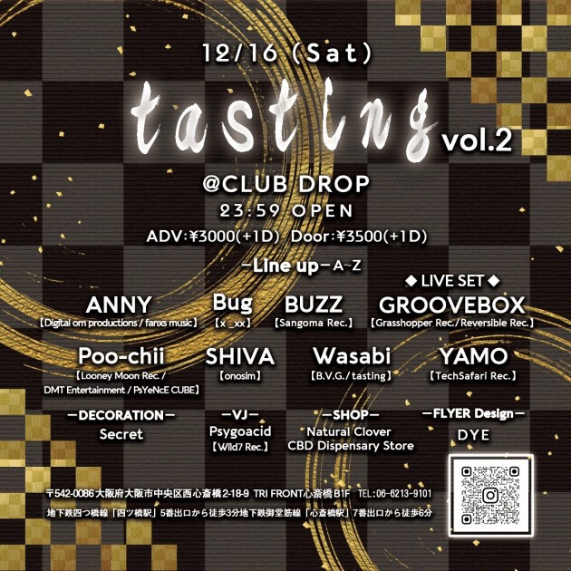 12/16 (Sat) tasting Vol.2 in DROP DJ WasabiPsychedelic Party @CLUB DROP @drop_osaka ADV:¥3000(+1D) Door:¥3500(+1D)