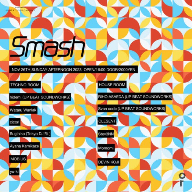 UP BEAT!SOUNDWORKSが新しく立ち上げたパーティー”Smash”は混沌としたPartyがありふれている日曜日に新たな風を吹き込む。ミュージックジャーニーの終着点として日曜日の午後にたどり着いて欲しい。