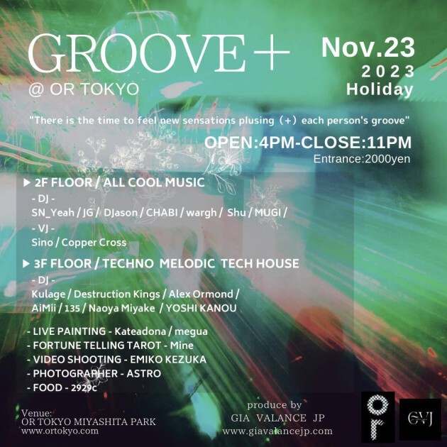 GOOVE+は、”個々のグルーヴを+(プラス)していく中で、新たな感覚に触れる時間”をコンセプトに、新たな感覚を探求するパーティーです。音と音の感覚を変化させ、心が躍動し、感情が踊る新しい感覚を追求。