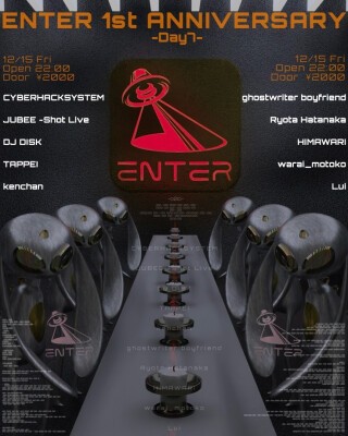 2022年12月15日にオープンしたENTER SHIBUYA。この度、1周年を祝した3週間に及ぶ9日間のアニバーサリーパーティを開催する。記念すべきDAY7は、渋谷のストリートカルチャーの重要人物たちが集結。Y2Kブームの火付け役といっても過言ではないサウンドプロジェクトRave Racersの創始者JUBEE、同じくメンバーのCYBERHACKSYSTEM、warai_motoko、ラッパーkZmのDJ名義ghostwriter boyfriend、ENTERでSAMOとMUZIC BOXをオーガナイズするマルチアーティストDJ DISK、タトゥーアーティストTAPPEI、VJ兼Tokyo Vitaminのメンバーであるkenchan、CANNABISよりRyota HatanakaとHIMAWARI、ENTERにてUNDERRATED、アンダーシステムを主催するLuiが出演する。各々がクラブやDJのみならず、多岐にわたって活動するマルチアーティストが邂逅、ENTERのフロアを東京の中心地、渋谷のエネルギーで満たす。