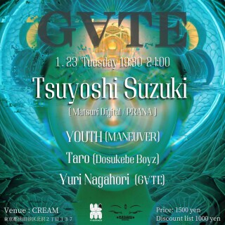 The first guest will be Tsuyoshi Suzuki ( Matsuri Digital / PRANA ) , one of Japan's leading DJs who has played on the main stage of Boom Festival, has released numerous masterpieces, remakes, and compilations from Matsuri Productions, and has also started new projects UbarTmar and GoKen. Plus, There are a wide range of techno and trance Djs, YOUTH (MANEUVER), Taro (Dosukebe Boyz), and Yuri Nagahori, who is the organizer of this party !