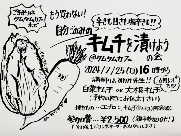 大好評キムチワークショップ第4弾!前回とはレシピの違うヤンニョム、そして白菜か大根かを選べるWSです。熟成したら旨味が増していくヤンニョムは多目に持って帰ってもらって、お家でお好きな物を漬けれる様に。甘さ、辛さ、薬味などあなたが美味しいと思うヤンニョムに仕上げて下さい♡参加した事のある皆さんも、興味あるけどやった事が無い皆さんもぜひ☆飲みだけの見学もできますよ!ご予約は☞ @tamutamucafe まで◎