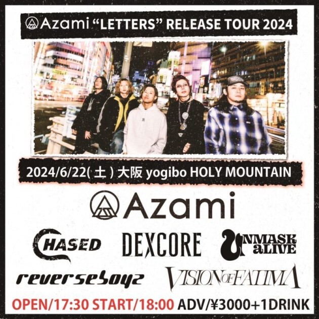 OPEN 17:00 - START 18:00 ※OPEN/STARTが変更になりました。 Azami / CHASED / DEXCORE / ReVERSE BOYZ / UNMASK aLIVE / Vision of Fatima チケットお求めはこちら! https://eplus.jp/sf/detail/4044840001-P0030001
