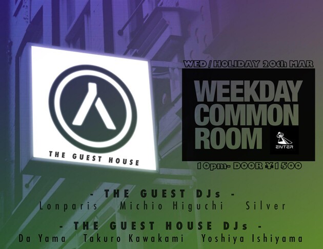 週末深夜のクラブでのパーティのみならず、アフターアワーズパーティや、シークレットヴェニューでの24時間パーティー開催など時間や場所に形骸化されることなく、世代・国籍をも超えて音楽を愛する人々へのおもてなしと、人生において底抜けに踊り無邪気に騒ぐことの“豊かさ”を提示するメンバーが集うTHE GUEST HOUSE。
