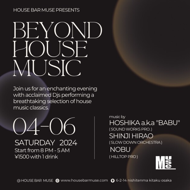 With a career spanning over 30 years, their song selections, backed by their experience, truly tell the history of house music. BEYOND" is the only house party that can be enjoyed by men and women of all ages and generations. Please come and listen to the true HOUSE DJ's performance from new releases to classics.