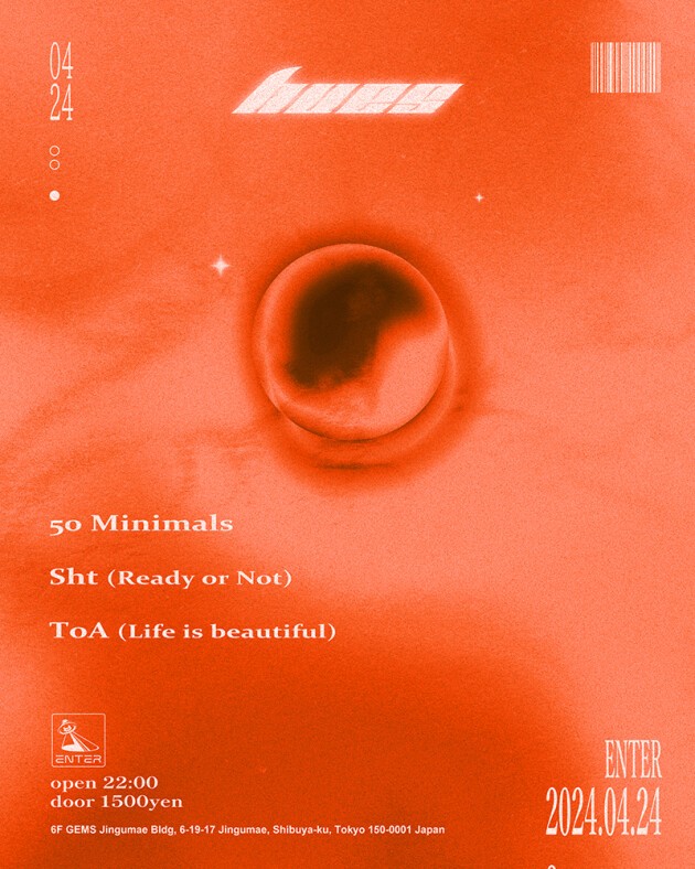 Line-up: 50 Minimals Sht (Ready or Not) ToA (Life is beautiful) グルーヴキーパーがENTER SHIBUYAに集結。ハウス、ディスコを主軸に、あらゆる音像を凝集させた多幸感溢れる一夜 Open 10PM ¥1500 Door